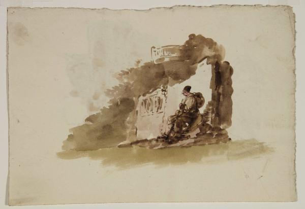 Figura seduta immersa in un paesaggio. Figura seduta immersa in un paesaggio