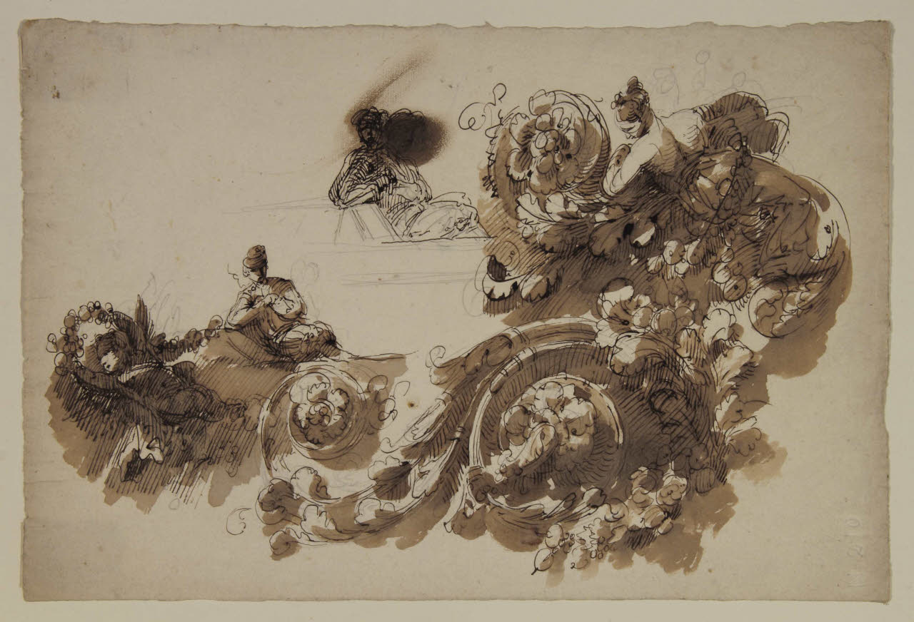 Particolare di un fregio decorativo con volute floreali e figurette mitologiche. Particolare di un fregio decorativo con volute floreali e figurette mitologiche