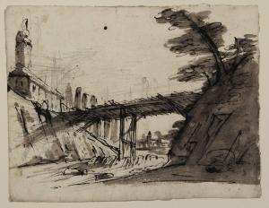 Paesaggio fluviale con ponte, edifici e dirupi. Paesaggio fluviale con ponte, edifici e dirupi
