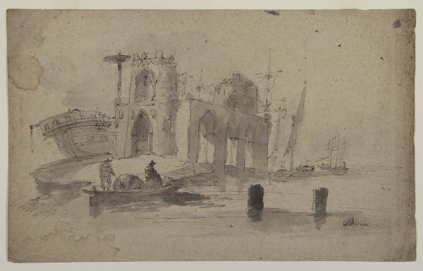 Veduta di un porto con imbarcazioni e macchiette. Veduta di un porto con imbarcazioni e macchiette