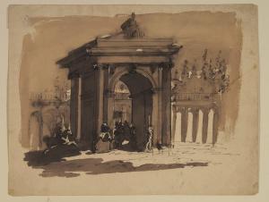 Arco trionfale a un fornice attraversato da armigeri a cavallo. Arco trionfale a un fornice attraversato da armigeri a cavallo