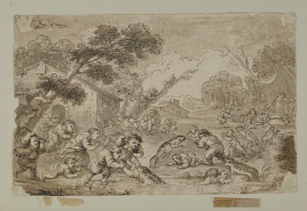 - NOTIZIE STORICO CRITICHE Il disegno raffigura una battaglia tra pigmei e rane ed è attribuito a Enrico Albrici, "del quale ritorna il tratto breve e nervoso, riccioluto nel delineare la vegetazione, seghettato a ventaglio nel dare l'idea delle mani" (Olivari 1990). Sebbene di formato rettangolare, il foglio è una copia della tela ovale dipinta da Faustino Bocchi, oggi in collezione privata bresciana.