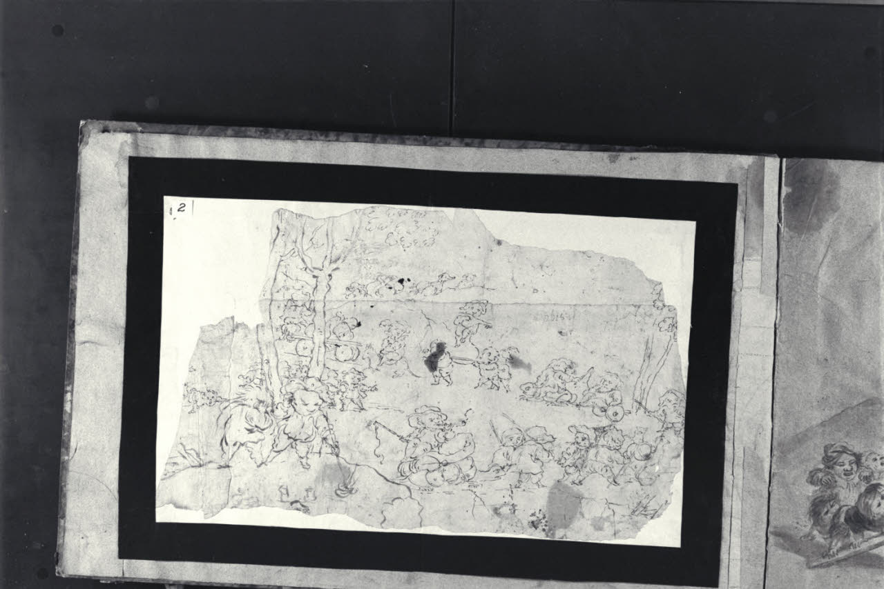 - NOTIZIE STORICO CRITICHE Nell'album L D 2, entrato nelle collezioni civiche con il Legato Guasconi del 1863, sono conservati diciotto disegni raffiguranti studi per vivaci e umoristiche scene di nani che si divertono, svolgono attività quotidiane oppure lottano tra loro o contro animali apparentemente giganteschi. Sebbene rimanga ancora incerta la paternità di alcuni fogli, il taccuino, già avvicinato a Faustino Bocchi, è attribuito ad Enrico Albrici, che a partire dal 1763 si dedicò alle bambocciate di nani. I disegni, a matita nera e a inchiostro acquerellato, sono eseguiti direttamente sulle pagine del taccuino o su fogli incollati all'album.\nIl presente disegno raffigura un corteo di carri e nani in uno spazio esterno. Si distingue per la tecnica, per la composizione del foglio, composto da tre frammenti incollati prima dell'esecuzione dello schizzo, e per la stesura, che mostra i segni di due diversi interventi: la prima mano, nervosa e rapida, è sovrapposta in alcune parti da un'altra, dalle linee più liquide e larghe, attribuita da Olivari all'Albrici (Olivari 1990).