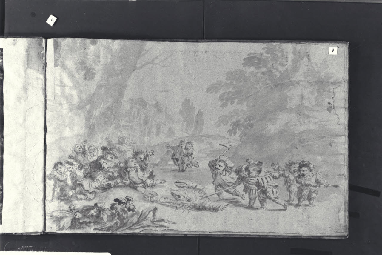 - NOTIZIE STORICO CRITICHE Nell'album L D 2, entrato nelle collezioni civiche con il Legato Guasconi del 1863, sono conservati diciotto disegni raffiguranti studi per vivaci e umoristiche scene di nani che si divertono, svolgono attività quotidiane oppure lottano tra loro o contro animali apparentemente giganteschi. Sebbene rimanga ancora incerta la paternità di alcuni fogli, il taccuino, già avvicinato a Faustino Bocchi, è attribuito ad Enrico Albrici, che a partire dal 1763 si dedicò alle bambocciate di nani. I disegni, a matita nera e a inchiostro acquerellato, sono eseguiti direttamente sulle pagine del taccuino o su fogli incollati all'album\nIl presente disegno raffigura un gruppo di nani che cerca di catturare un gambero.