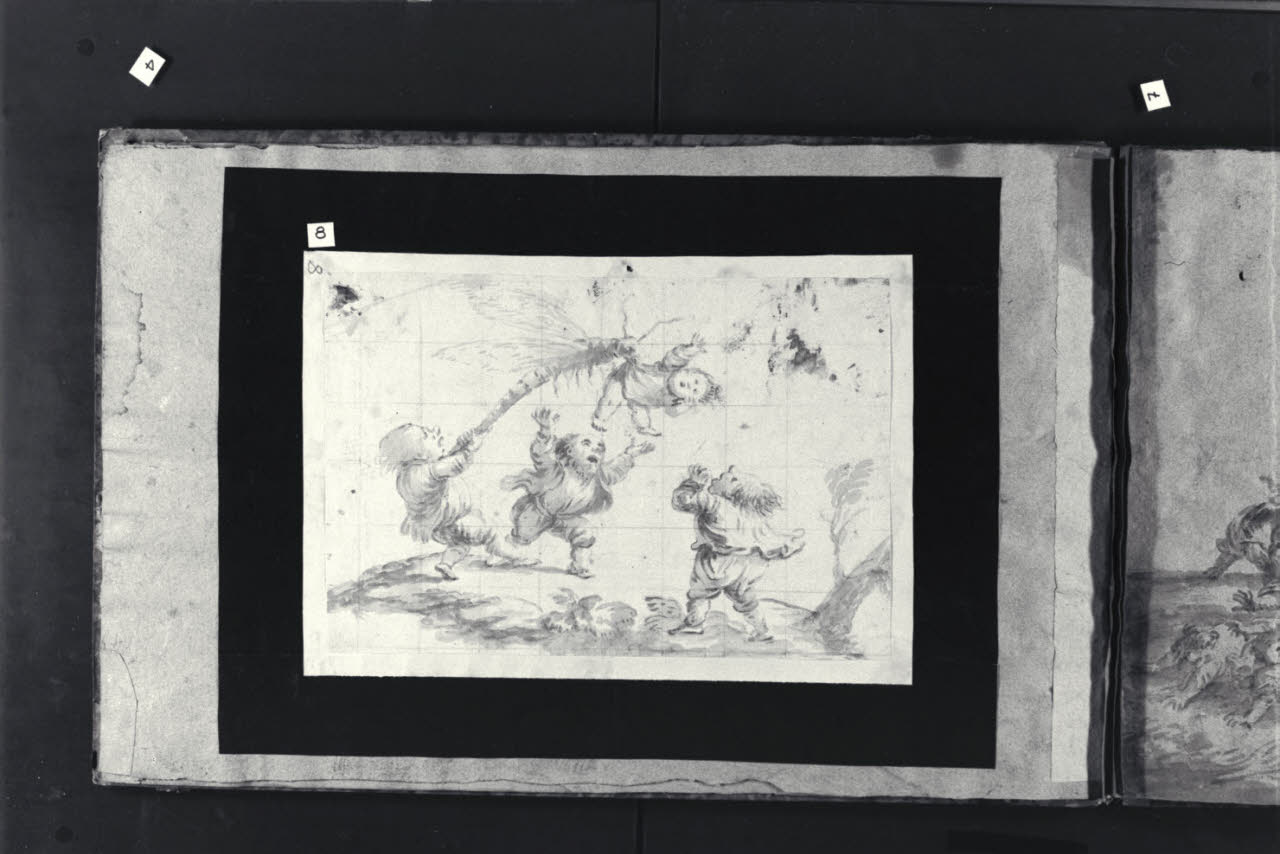 - NOTIZIE STORICO CRITICHE Nell'album L D 2, entrato nelle collezioni civiche con il Legato Guasconi del 1863, sono conservati diciotto disegni raffiguranti studi per vivaci e umoristiche scene di nani che si divertono, svolgono attività quotidiane oppure lottano tra loro o contro animali apparentemente giganteschi. Sebbene rimanga ancora incerta la paternità di alcuni fogli, il taccuino, già avvicinato a Faustino Bocchi, è attribuito ad Enrico Albrici, che a partire dal 1763 si dedicò alle bambocciate di nani. I disegni, a matita nera e a inchiostro acquerellato, sono eseguiti direttamente sulle pagine del taccuino o su fogli incollati all'album\nIl presente disegno è quadrettato e raffigura un gruppo di nani che tenta di liberare un fanciullo rapito da una libellula.
