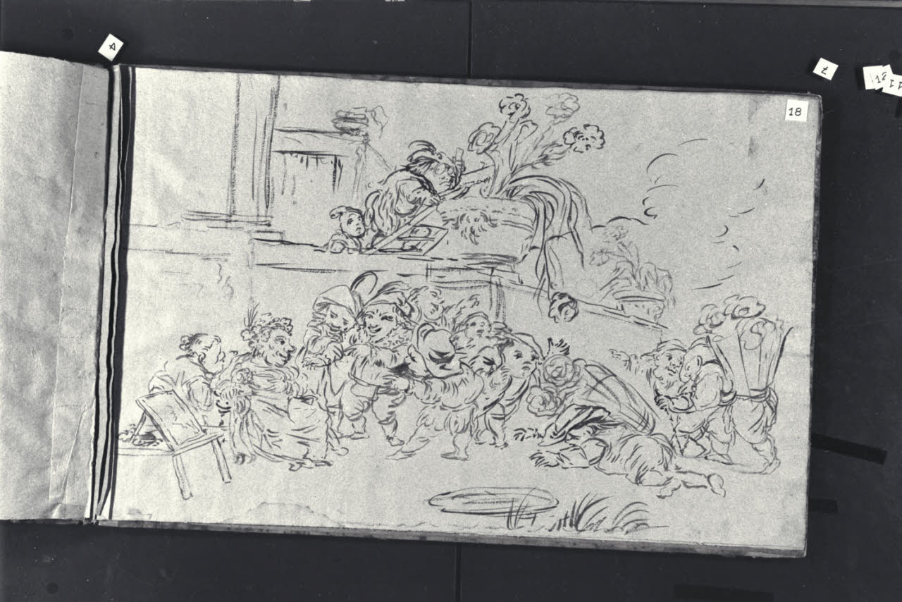 - NOTIZIE STORICO CRITICHE Nell'album L D 2, entrato nelle collezioni civiche con il Legato Guasconi del 1863, sono conservati diciotto disegni raffiguranti studi per vivaci e umoristiche scene di nani che si divertono, svolgono attività quotidiane oppure lottano tra loro o contro animali apparentemente giganteschi. Sebbene rimanga ancora incerta la paternità di alcuni fogli, il taccuino, già avvicinato a Faustino Bocchi, è attribuito ad Enrico Albrici, che a partire dal 1763 si dedicò alle bambocciate di nani. I disegni, a matita nera e a inchiostro acquerellato, sono eseguiti direttamente sulle pagine del taccuino o su fogli incollati all'album.\nIl presente disegno, dalla linea continua e corsiva (Baroncelli 1990), raffigura un gruppo di nani che rendono omaggio ad una dama.