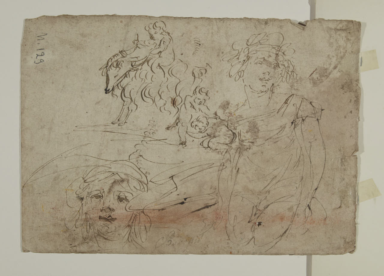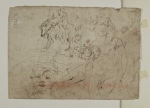 Un putto in groppa a un caprone e due putti lottanti, giovane inginocchiata e testa di fanciulla