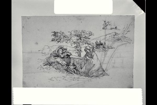 Sacra Famiglia in un paesaggio classico; Due cacciatori con un cane