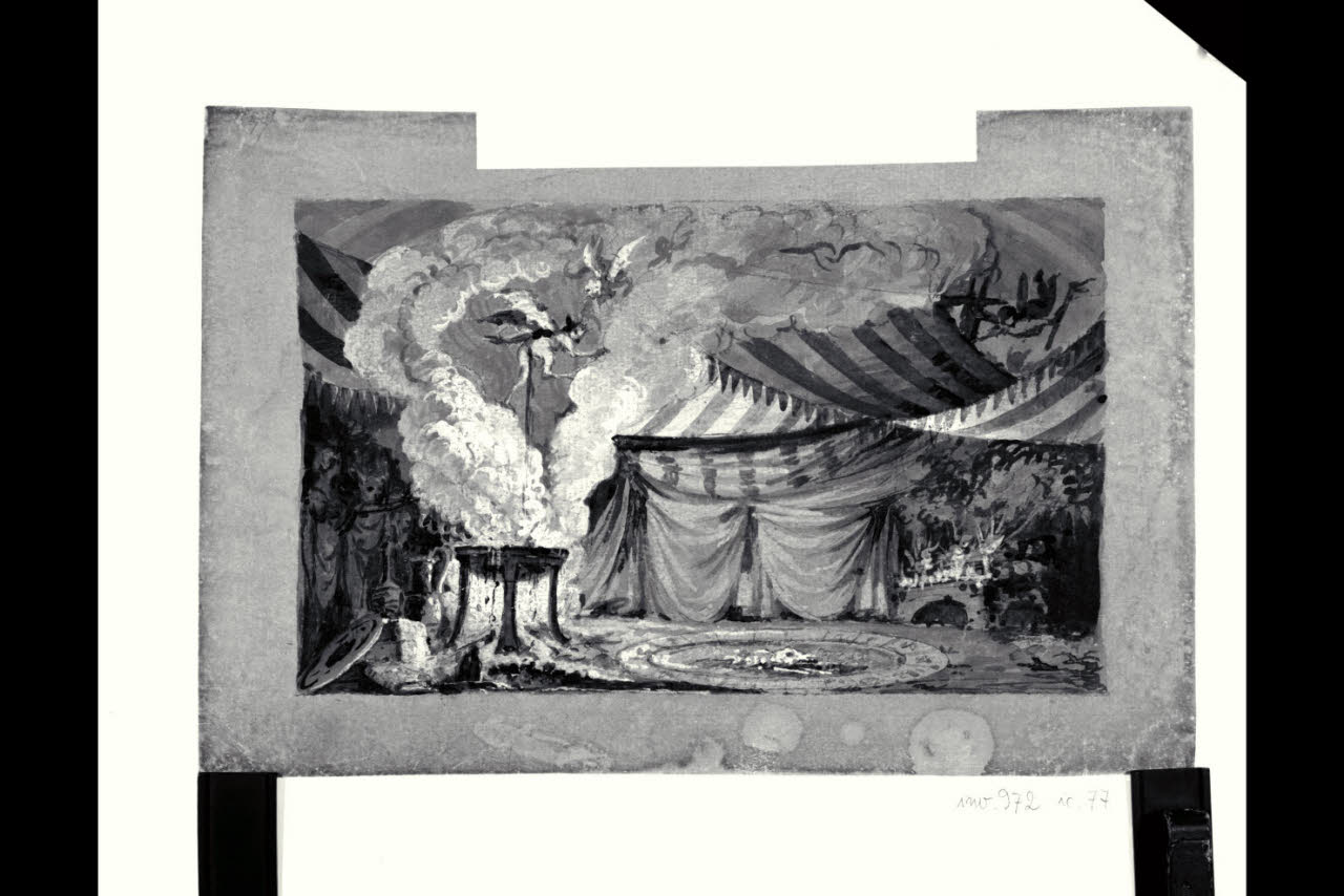 - NOTIZIE STORICO CRITICHE Il foglio potrebbe essere collegabile agli studi di scenografia per il ballo "Il noce di Benevento", di Salvatore Viganò, dato nel 1812 al Teatro Riccardi di Bergamo come interemezzo del melodramma serio di Giovanni Simone Mayr "Adelasia e Aleramo". Alle scene del balletto lavorarono Vincenzo Bonomini e Pietro Ronzoni.\n