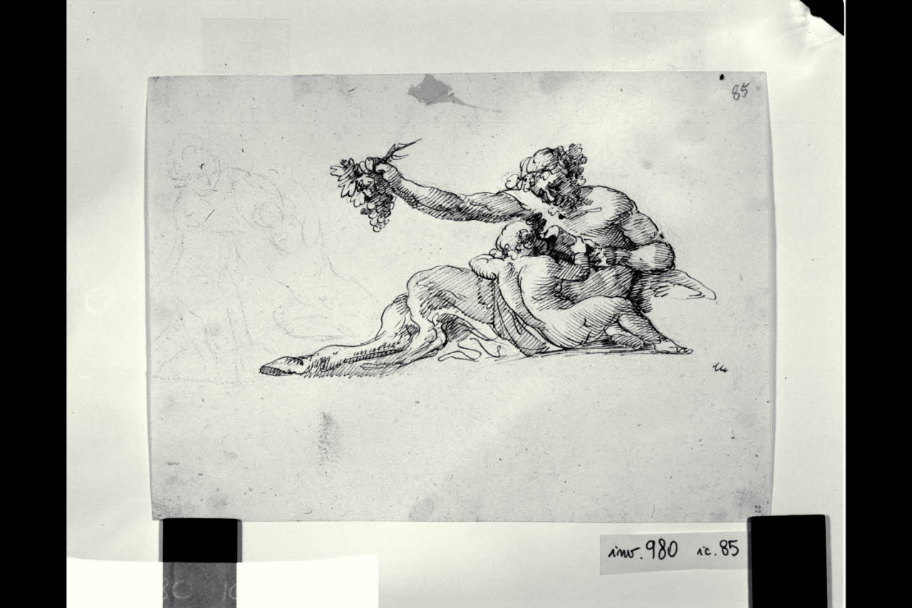 Sileno inizia al vino Bacco fanciullo e schizzo di putto che beve da un vaso portogli da un compagno