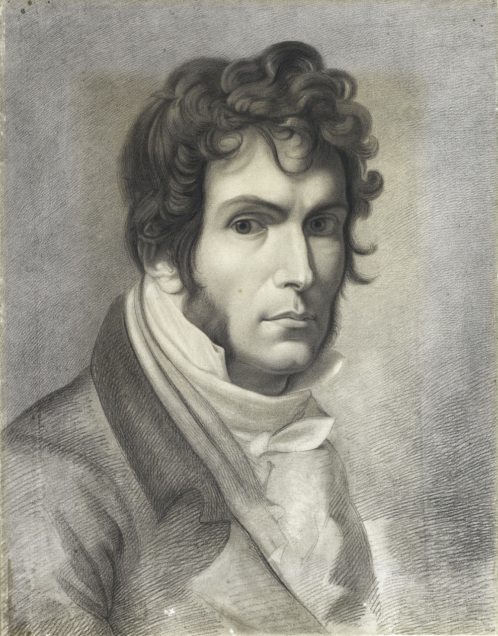- NOTIZIE STORICO CRITICHE Il disegno venne donato al Comune di Milano nel 1880 da Eugenia Marie Schmutziger, moglie di Giulio Mylius, membro di una famiglia fortemente impegnata nella promozione artistica della città di Milano e nipote di Enrico Mylius, amico di Gaetano Cattaneo, esecutore testamentario di Giuseppe Bossi. Dato il formato, le ricorrenze formali e la puntualità nella ripresa dei particolari, si può ipotizzare che il disegno sia stato eseguito subito prima di un dipinto con stesso soggetto in collezione privata, intorno al 1805-1810. Il pittore sceglie di raffigurarsi di tre quarti e con lo sguardo laterale, rivolto in basso, sfuggendo il contatto visivo diretto con lo spettatore.