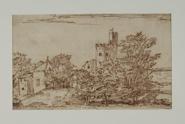 Paesaggio con torre e piccola chiesa. Paesaggio con torre e piccola chiesa