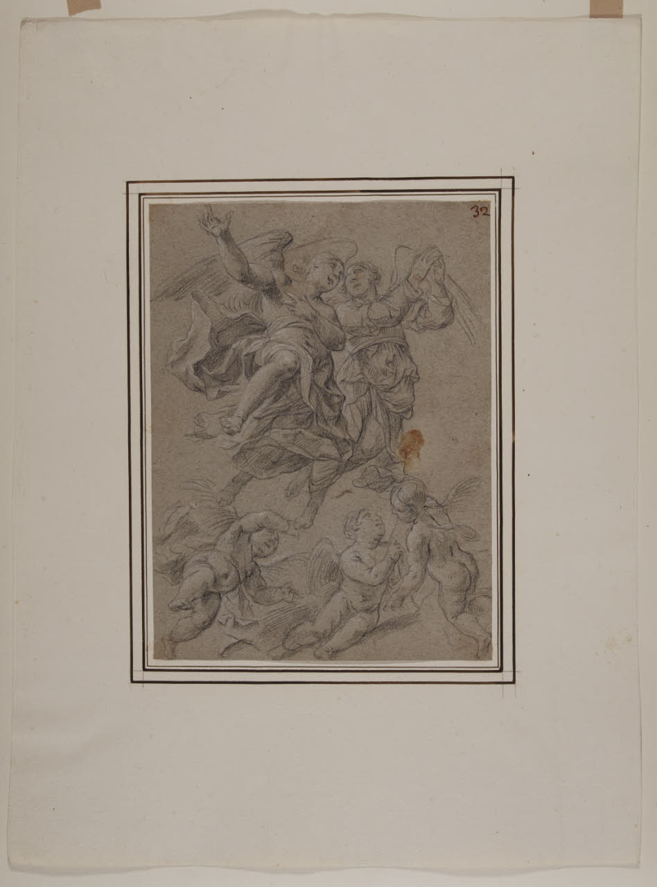 - NOTIZIE STORICO CRITICHE Il disegno fa parte di un nucleo di 34 fogli, alcuni dei quali noti agli studi, tutti realizzati a matita nera e gessetto bianco su carta grigia (eccezion fatta per uno, a matita rossa e gessetto bianco sempre su carta grigia). Tra questi, alcuni recano un'iscrizione attributiva di Giuseppe Bossi e un numero a penna; a livello stilistico (come confermato anche nei casi dei disegni pubblicati), la serie è ascrivibile alla mano del pittore barocco lombardo Antonio Busca. \nNell'inventario del 1814 dei beni di Alberico XII Barbiano di Belgioioso (trascritto in M. Forni, "Abitare da principe. Le residenze e le collezioni di Alberico XII Barbiano di Belgiojoso", 2020), nella Cartella G "che contiene i disegni antichi" sono registrati "33 tutti del Busca", stimati £ 66.
