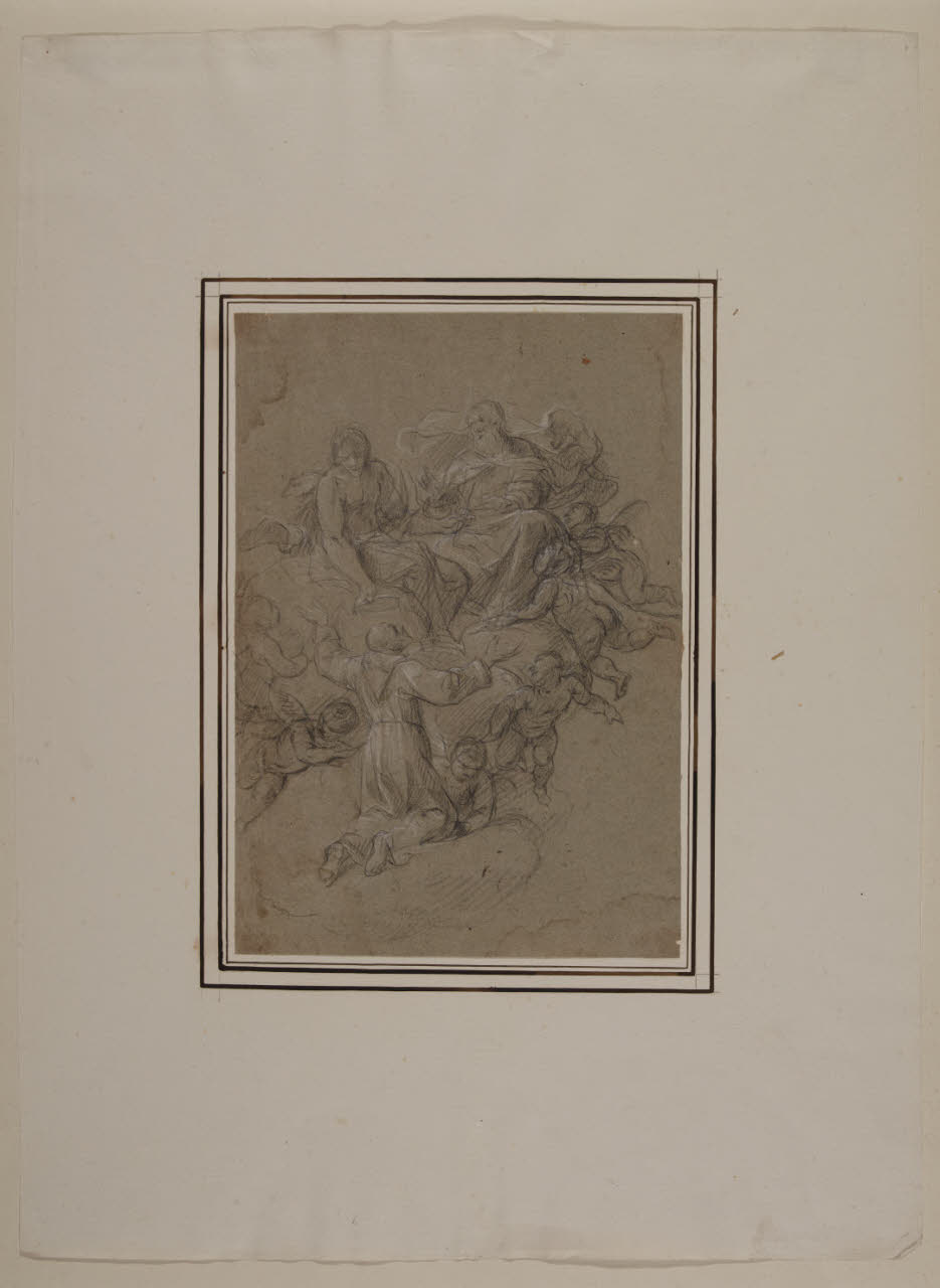 - NOTIZIE STORICO CRITICHE Il disegno fa parte di un nucleo di 34 fogli, alcuni dei quali noti agli studi, tutti realizzati a matita nera e gessetto bianco su carta grigia (eccezion fatta per uno, a matita rossa e gessetto bianco sempre su carta grigia). Tra questi, alcuni recano un'iscrizione attributiva di Giuseppe Bossi e un numero a penna; a livello stilistico (come confermato anche nei casi dei disegni pubblicati), la serie è ascrivibile alla mano del pittore barocco lombardo Antonio Busca. \nIl foglio è stato identificato da Bruzzese (2017) come una variante di studio per l'affresco con questo soggetto nella cappella XX del Sacro Monte d'Orta.\nNell'inventario del 1814 dei beni di Alberico XII Barbiano di Belgioioso (trascritto in M. Forni, "Abitare da principe. Le residenze e le collezioni di Alberico XII Barbiano di Belgiojoso", 2020), nella Cartella G "che contiene i disegni antichi" sono registrati "33 tutti del Busca", stimati £ 66.