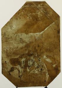 - NOTIZIE STORICO CRITICHE Identificato da Giovanni Morelli come autografo di Luca Cambiaso, il disegno raffigura l'Adorazione dei pastori: le figure sono coperte da una tettoia, è buio e l'unica fonte di luce è Gesù, che illumina i volti delle cinque figure e il muso del bue; in ombra è una figura che osserva la scena. In secondo piano, due diversi episodi: in alto, l'Annuncio ai pastori e, più sotto, un corteo di questi ultimi. La composizione è sovrastata da un girotondo di angeli. Nel disegno sono distinguibili le due caratteristiche dei disegni dell'attività tarda di Cambiaso: il modulo cubico e l'ambientazione notturna ottenuta senza l'uso di lumeggiature, ma solo mediante l'inchiostro scuro (Spadaccini 2015).