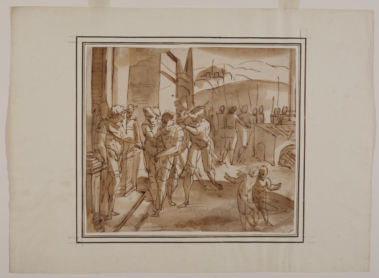 - NOTIZIE STORICO CRITICHE Il disegno, verosimilmente da porre in relazione con un episodio veterotestamentario o di storia antica, è stato attribuito da Nicodemi a Cambiaso e identificato erroneamente come una Flagellazione. Probabile che nel foglio l'artista di Moneglia abbia studiato un'ipotetica scena da riprodurre, eventualmente, in una delle due volte dei palazzi genovesi nei quali lavorò tra 1560 e 1565, realizzando cicli ispirati all'antica Roma: il Palazzo di Vincenzo Imperiale in piazza Campetto e quello di Ottavio Grimaldi Cebà al Bisagno.