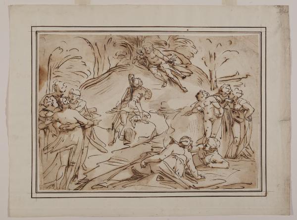 - NOTIZIE STORICO CRITICHE Nella vasta produzione grafica di Luca Cambiaso, argomento ancora molto dibattuto, sono spesso incluse anche copie della sua folta bottega o più tarde, se non addirittura di Cambiaso stesso, conservate in musei europei e americani; esse mostrano sovente lievi varianti. Attribuito a Cambiaso da Giorgio Nicodemi (1943), il foglio è stato accostato da Suida Manning e Suida (1958) all'affresco realizzato attorno ai primi anni Sessanta del Cinquecento nel salone di Palazzo Spinola Pessagno a Genova. Lo stesso tema è presente in altri due esemplari, conservati al Gabinetto Disegni e Stampe degli Uffizi (inv. 13819 e inv. 13802).
