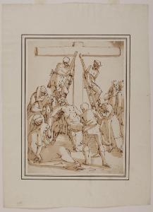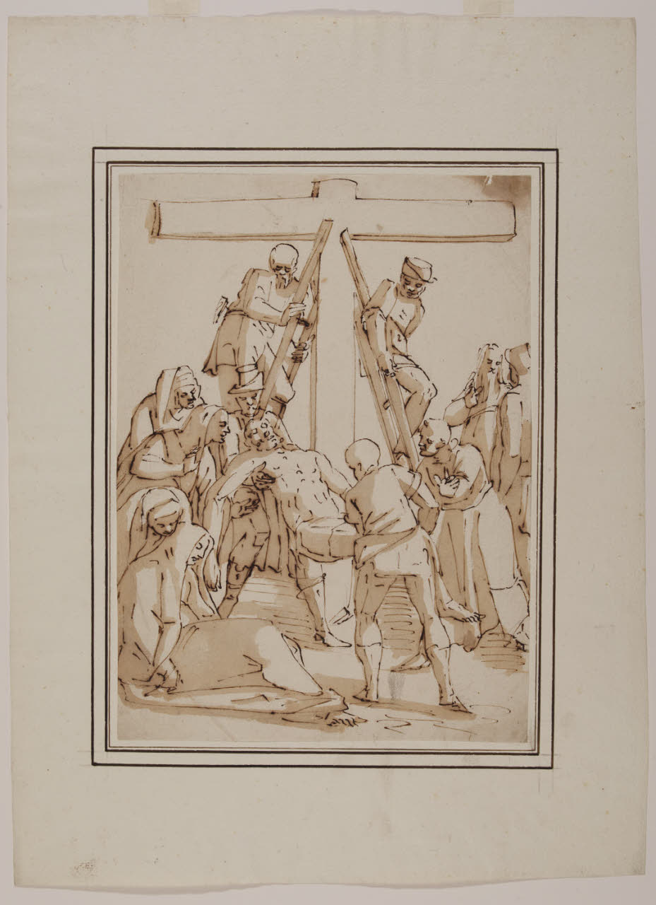 - NOTIZIE STORICO CRITICHE Nella vasta produzione grafica di Luca Cambiaso, argomento ancora molto dibattuto, sono spesso incluse anche copie della sua folta bottega o più tarde, se non addirittura di Cambiaso stesso, conservate in musei europei e americani; esse mostrano sovente lievi varianti. Del tema sono presenti esemplari e derivazioni, custoditi presso la Veneranda Biblioteca Ambrosiana (inv. F 268 inf. n. 110), Museo del Louvre di Parigi (inv. 9246), Musée des Beaux-Arts di Besançon (inv. 3958 D), Museum of Art di Providence (inv. 50.298), Palazzo Abatellis a Palermo (inv. 5237/95), Museo del Prado di Madrid (inv. D001889). Il disegno mostra analogie con un dipinto cambiasesco, del 1575 circa, esposto nella chiesa di Santa Chiara in San Martino d'Albaro a Genova. Secondo Giulio Bora (parere orale), si tratterebbe di una copia da un originale di Luca Cambiaso.