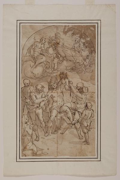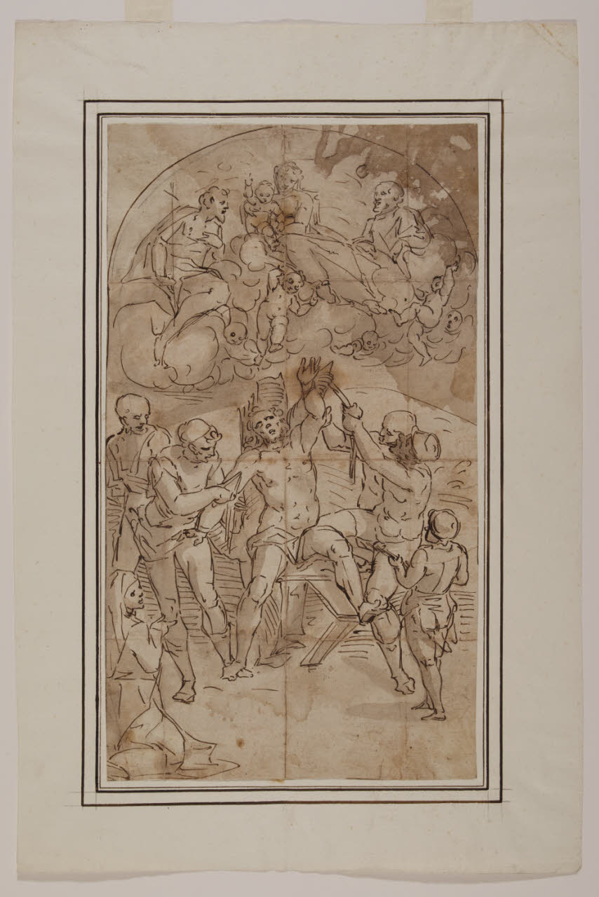 - NOTIZIE STORICO CRITICHE Nella vasta produzione grafica di Luca Cambiaso, argomento ancora molto dibattuto, sono spesso incluse anche copie della sua folta bottega o più tarde, se non addirittura di Cambiaso stesso, conservate in musei europei e americani; esse mostrano sovente lievi varianti. Il disegno, attribuito a Cambiaso da Nicodemi (1943), può essere collegato alla tela cambiasesca del 1564 realizzata per la badessa del monastero di San Bartolomeo dell'Olivella (Genova); dopo la soppressione del convento, il dipinto è stato trasferito nell'Oratorio dei Re Magi, distrutto durante la Seconda Guerra Mondiale, e oggi si trova presso il convento dei cappuccini di Albano Laziale. Esistono altri fogli raffiguranti il "Martirio di san Bartolomeo", conservati alla Veneranda Biblioteca Ambrosiana (inv. F 261 inf. n. 136) e al Gabinetto Disegni e Stampe degli Uffizi (inv. 13792).