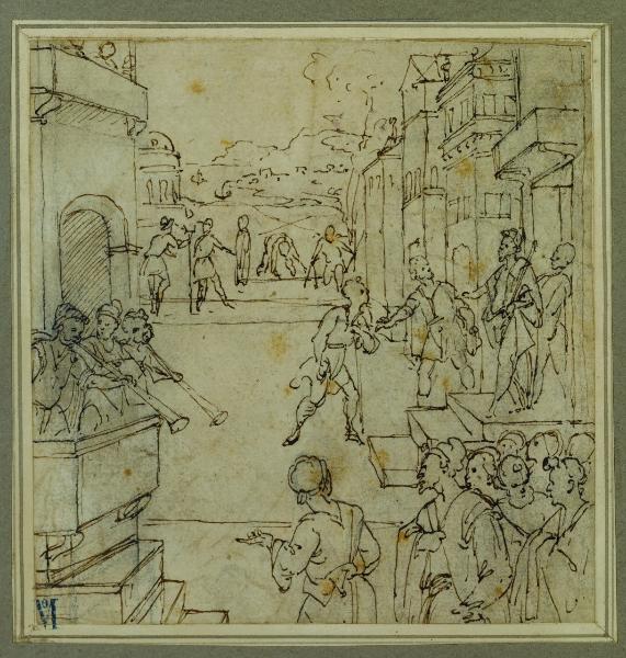 Scena di città con l'accoglimento di un personaggio. Scena di città con l'accoglimento di un personaggio
