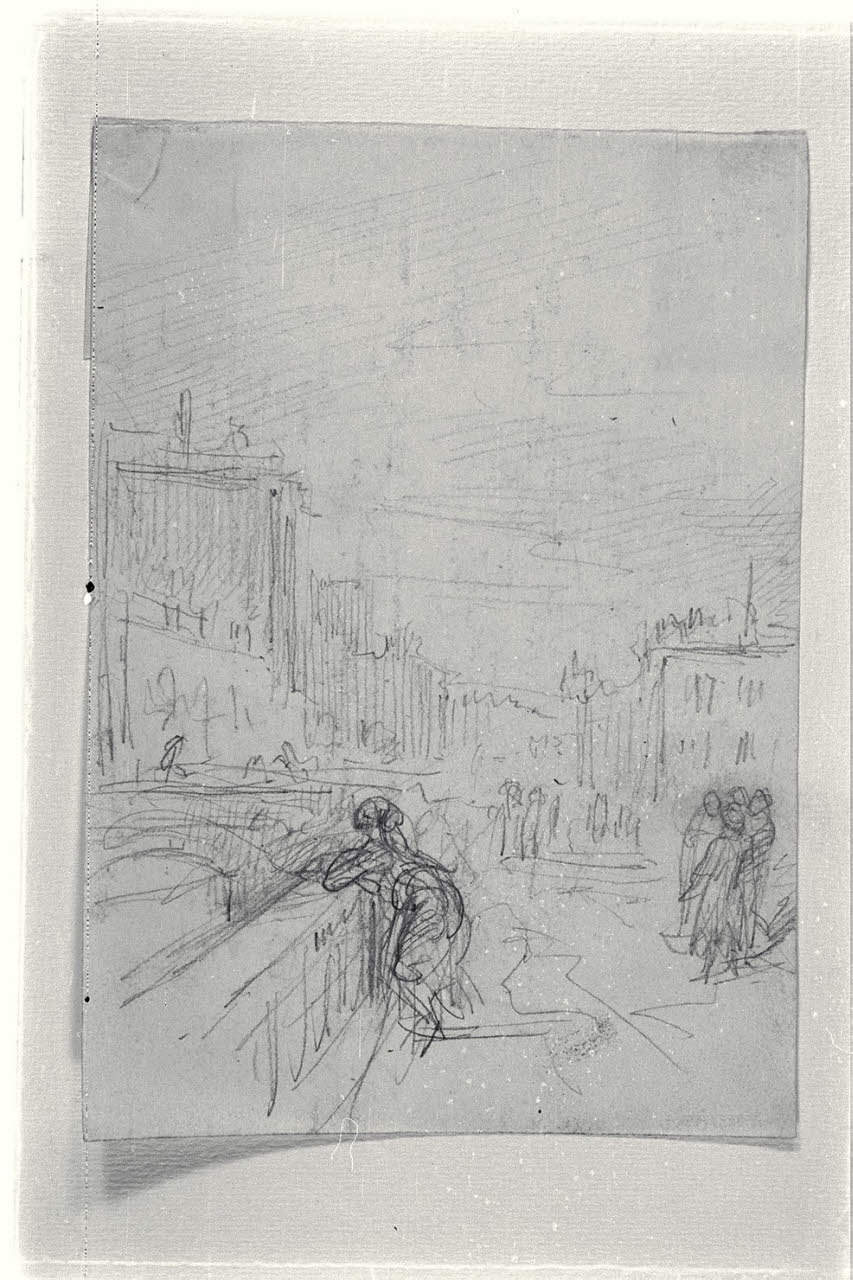 Contrada cittadina, con figurette, e donna appoggiata al muricciolo di un fossato