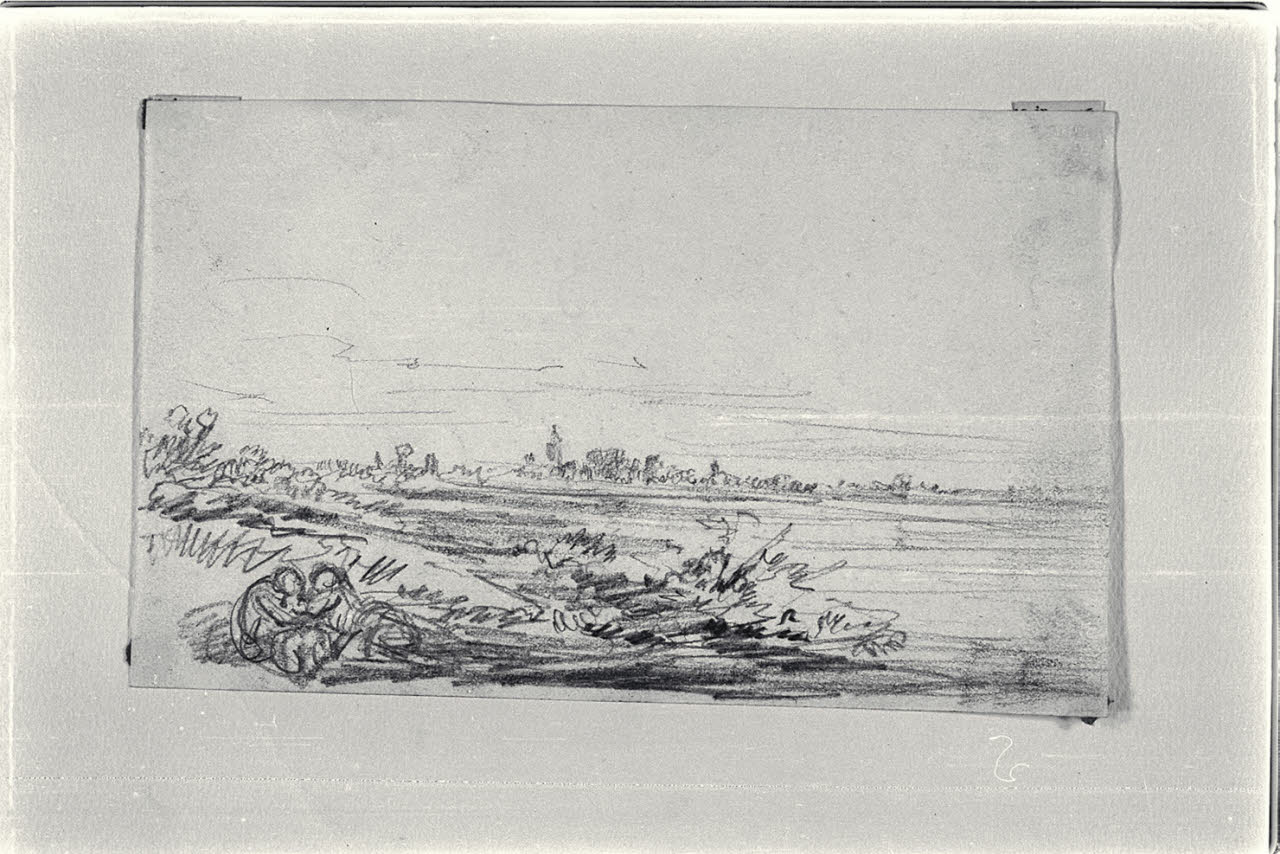 Paesaggio lacustre con coppia di amanti sdraiati sulla riva