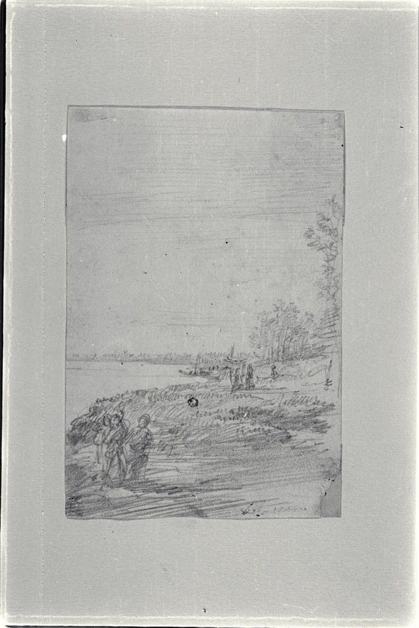 Riva di lago, con barche e figure
