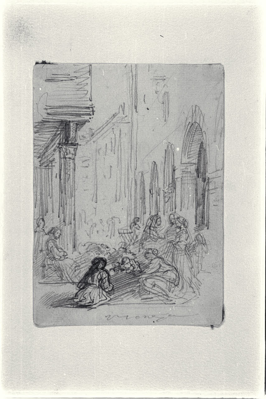 Contrada cittadina con portici e scalinata, figure in piedi e sedute