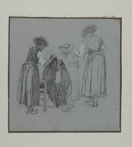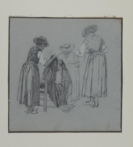- NOTIZIE STORICO CRITICHE Il tema popolare deve aver suscitato da sempre l'interesse di Ciardi, tanto da trattarlo in pittura nel 1874 (Venezia, Galleria Internazionale d'Arte Moderna, Ca' Pesaro). Il soggetto si inserisce nel novero di motivi desunti dalla civiltà contadina, che l'autore iniziò a esplorare a cavallo tra anni sessanta e settanta, quando intraprese una sistematica ricognizione della campagna trevigiana. La bravura di Ciardi è quella di saper trasfigurare un complesso rito, come l'acconciatura di una ragazza, equiparandolo a un cerimoniale articolato. A differenza del dipinto, trattato al pari di un veloce bozzetto, nel disegno l'artista si sofferma maggiormente sui dettagli della scena; a livello compositivo, il foglio si presenta più complesso per il numero maggiore di personaggi impegnati nell'azione. Il particolare punto di vista adottato, che a differenza dell'olio cela il volto della ragazza, favorisce l'identificazione del nucleo principale dell'azione.