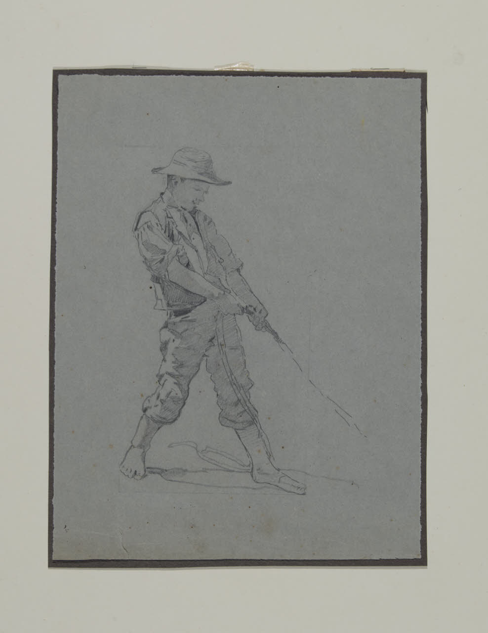 - NOTIZIE STORICO CRITICHE Il giovane pescatore, in atto di issare una rete, è assimilabile a una delle tante figurette che animano le opere di Ciardi. La particolare vicinanza stilistica agli altri disegni dell'autore presenti nelle collezioni del Gabinetto dei disegni del Castello Sforzesco e la consonanza con i personaggi raffigurati in opere come Pescatori in Laguna giustificano una datazione del foglio agli anni settanta dell'Ottocento.