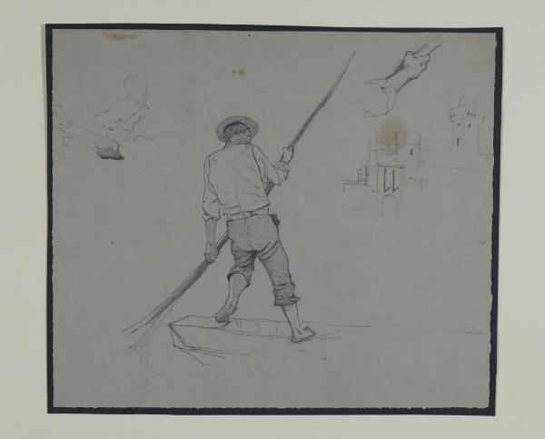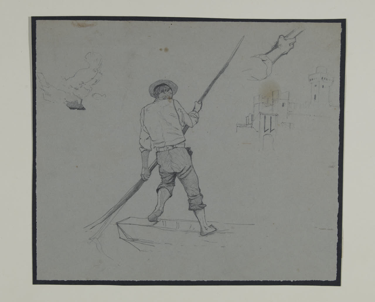 Barcaiolo e schizzi di una mano, di una gallina e di un castello