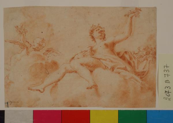 Figura femminile e putto alato sulle nubi che spargono fiori. Figura femminile e putto alato sulle nubi che spargono fiori