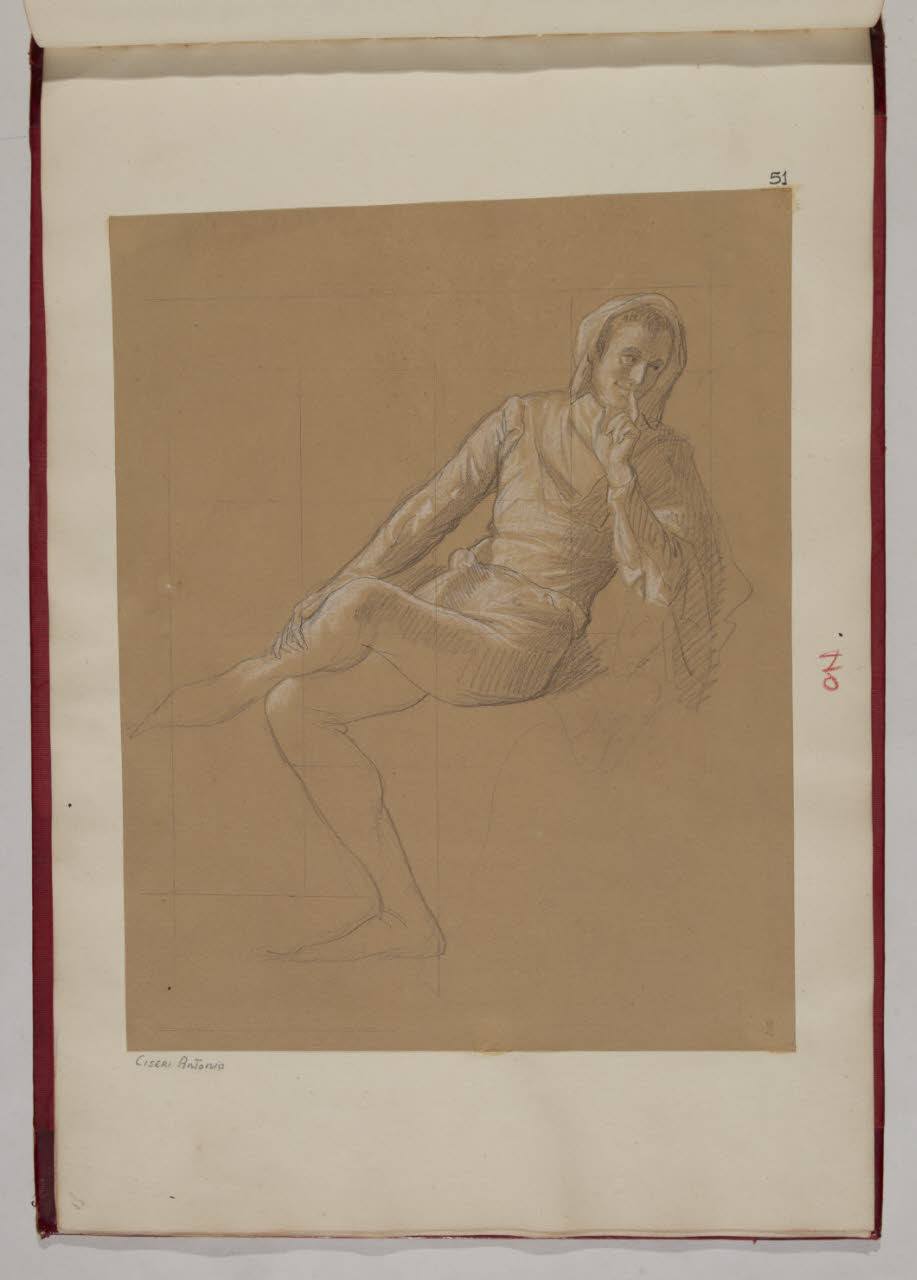 - NOTIZIE STORICO CRITICHE Il disegno si richiama, per il soggetto in costume, ai grandi quadri di ispirazione storica a cui Ciseri lavorò fin dagli anni della frequentazione dell'Accademia. Si datano al 1839 due bozzetti a olio, Morte di Lorenzo il Magnifico e Dante nella bottega di Giotto; del 1844 è Giano della Bella che parte da Firenze per il volontario esilio, dipinto ispirato a un romanticismo di matrice bezzuoliana. È probabile che il personaggio raffigurato, pur non riconducibile a un'opera certa, sia stato utilizzato da Ciseri all'interno di una scena medievale di cui non sono sopravvissute notizie, come pare testimoniare anche la quadrettatura a matita nera.