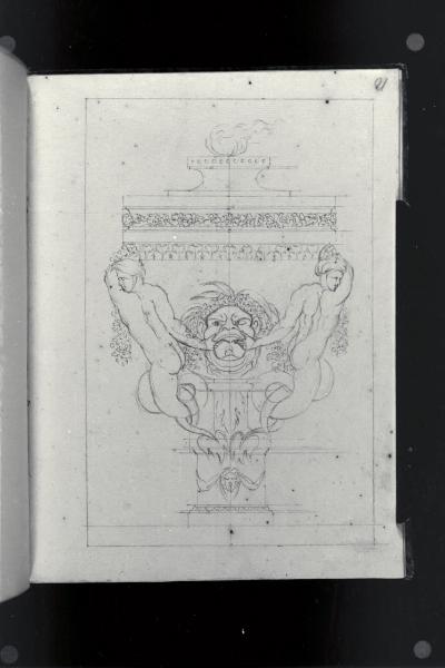 Idee di varii vasi: Vaso ardente, con mascherone e tritoni