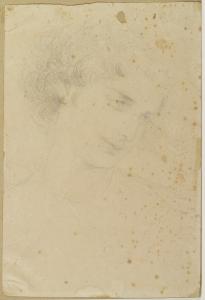 - NOTIZIE STORICO CRITICHE Questo schizzo a matita di Tranquillo Cremona raffigura una testa di giovane donna di tre quarti verso destra e leggermente inclinata sulla spalla. La bellezza fiorente della modella è sottolineata dall'artista nell'indugio dei tratti di matita sulle labbra carnose e sulle ciocche di capelli ricciolute che le incorniciano il volto; lo sguardo intenso e languido allo stesso tempo della giovane donna caratterizza infine questo ritratto. \nIl disegno appartenne alla collezione del pittore, critico, mercante d'arte e mecenate Vittore Grubicy De Dragon che legò il proprio nome al divisionismo, di cui fu uno dei principali sostenitori in Italia insieme al fratello Alberto. Fu amico e sostenitore di Tranquillo Cremona, e a lui si deve la prima retrospettiva del pittore nel 1878, nel ridotto del Teatro alla Scala (Bossaglia 1994, p. 195). Questo disegno venne montato insieme ad altri due (Au. D 81 e Au. D 82) dello stesso Cremona su un supporto di cartone e viene indicato dal collezionista con la lettera "C", come proprietà della signorina Elisa Treccani. Inoltre, in basso a sinistra del cartone sul quale è incollata l'opera si legge la seguente nota manoscritta di Grubicy: "NB nel N° C Cremona disegnava ancora - come aveva appreso- colla mano destra. / Colla nuova visione pittorica intervenuta in lui coi "Due cugini" cfr. dip. trovò che la sua mano / destra procedeva con visiosa abilità e dispo= / tismo e la condannò per sempre, dipingendo / e anche disegnando colla sinistra più ubbi= / diente alla sua nuova visione. Il N° B è un / saggio di questa fase. / Vittore Grubicy De Dragon".