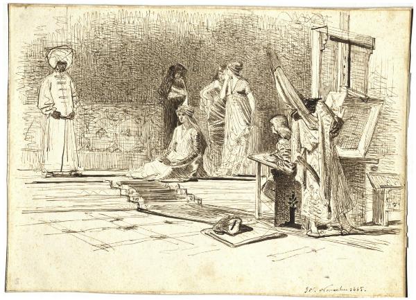 - NOTIZIE STORICO CRITICHE Il foglio illustra un pittore in una delle stanze del palazzo di un sultano mentre è intento a realizzare il ritratto di una giovane donna, alla presenza di alcuni personaggi della corte. Stando al titolo con il quale è tradizionalmente noto, questo disegno raffigurerebbe il pittore Gentile Bellini alla corte del sultano di Turchia mentre ne ritrae la figlia o, secondo altri, la favorita. Assiso al proprio tavolino, l'artista è intento a disegnare dal vero l'effigie della giovane donna inginocchiata in posa davanti a lui, mentre alle sue spalle un uomo dall'alto copricapo sembra scrutarne indiscretamente il lavoro, tenendo in mano il proprio ritratto eseguito probabilmente poco prima dallo stesso Bellini. Dal 1479 al 1481 il pittore veneziano soggiornò effettivamente alla corte di Mehmet II a Instanbul e durante questo periodo realizzò numerose opere, tra cui dovevano esservi anche un certo numero di ritratti, a cominciare da quello dello stesso sultano, oggi conservato presso la National Gallery di Londra. Eseguito a Milano nel novembre 1865, il disegno di Tranquillo Cremona è da mettere in relazione con un bozzetto dello stesso a olio su tela, già appartenuto a Giuseppe Crespi ( Bossaglia 1994, p. 112, n. 53).\nCon questo soggetto Tranquillo Cremona si cimenta nel paragone con l'insegnamento ricevuto anni prima a Venezia da Giuseppe Bertini, abile inventore di fantastiche riscostruzioni storiche e dalla felice vena decorativa (Bossaglia 1994). Nella città lagunare, il Cremona si era già esercitato in bozzetti di costume, ma la scena in questo caso non vuole essere una ricostruzione storica, quanto più una rievocazione di un momento biografico di Gentile Bellini, artista da lui apprezzato a Venezia, aprendo così la strada al "divertissement" borghese di immedesimazione in altre epoche storiche tanto in voga alla fine dell'Ottocento.
