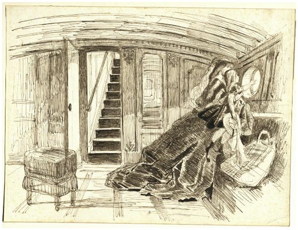 - NOTIZIE STORICO CRITICHE Il foglio, appartenuto alla collezione Luccardi, pervenne nelle raccolte comunali nel 1937 e illustrerebbe il ricordo di Tranquillo Cremona di una gita sul Lago di Como. La scena è ambientata nella sottocoperta dell'imbarcazione e mostra una madre che sostiene una bambina mentre, in piedi sul sedile, scruta curiosa il paesaggio dall'oblò. Il disegno è eseguito con grande perizia nella definizione dei dettagli, come la resa dei pesanti panneggi dell'abito della donna o la trasparenza del velo del suo cappellino. Costante della sua produzione artistica, anche questo foglio testimonia l'attrazione di Tranquillo Cremona per le dolcezze dei sentimenti.