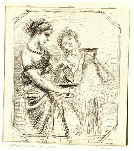- NOTIZIE STORICO CRITICHE Già appartenuto alla raccolta Luccardi, questo foglio di Tranquillo Cremona, eseguito a penna su carta bianca, illustra entro cornice ottagonale due baccanti di tre quarti che tengono delle coppe nelle mani.