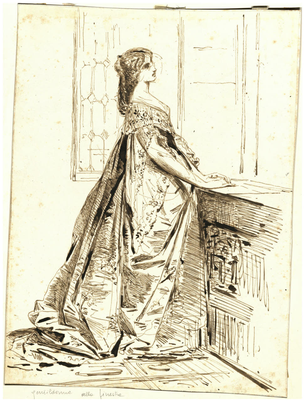 - NOTIZIE STORICO CRITICHE Già appartenuto alla collezione Luccardi, questo foglio di Tranquillo Cremona illustra una gentildonna mentre scruta fuori da una finestra aperta. Stilisticamente il foglio appartiene alla fase matura dell'artista, ovvero quando egli elaborò un proprio linguaggio personale, allontanandosi dagli insegnamenti accademici ricevuti e illustra una scena di vita quotidiana delle classi agiate, soggetto prediletto della produzione scapigliata di Cremona.