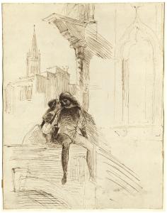 - NOTIZIE STORICO CRITICHE Già appartenuto alla collezione Luccardi, questo disegno di Tranquillo Cremona illustra un giovane in costume medievale seduto sul parapetto di una scala, mentre una giovane, pure in costume, si appoggia alla sua spalla. Nello sfondo si vede il particolare di un'architettura medievale e una chiesa. Il soggetto risente della pittura in costume cara al Romanticismo, sulla falsariga hayezziana (Bossaglia 1994). Come sovente nella produzione grafica di Cremona, il gruppo di figure è ben dettagliato, mentre gli elementi di contesto sono solo accennati con rapidi tratti, creando una sorta di non-finito, caratteristica questa che fu molto contestata dalla critica contemporanea.