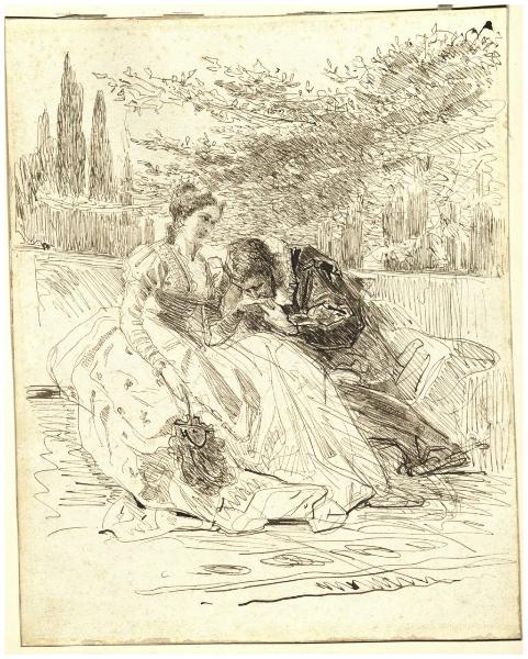 - NOTIZIE STORICO CRITICHE Il disegno, già appartenuto alla collezione Luccardi, mostra all'interno di un giardino, un cavaliere inginocchiato che bacia la mano ad una dama seduta, compiaciuta del gesto. Come sovente nella sua produzione pittorica, Tranquillo Cremona non si preoccupa di definire dei contorni netti per le figure, ma cura l'immediatezza emotiva della composizione di gusto ancora romantico attraverso la ricerca per i volti dei personaggi. Il foglio in esame si caratterizza per una trama brulicante di segni a penna che percorrono quasi tutta la superficie a creare un'atmosfera scenografica per questo duetto sentimentale, che sarà uno dei leitmotiv della poetica del Cremona.