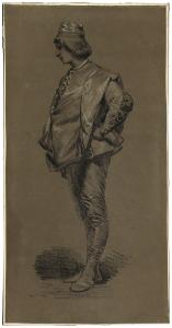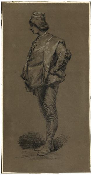 - NOTIZIE STORICO CRITICHE Il foglio mostra un uomo eretto di profilo verso sinistra in costume popolare, mentre porta una mano al fianco. Il disegno in esame può essere collocato cronologicamente nella seconda metà degli anni Sessanta, periodo in cui anche Faruffini, amico del Cremona, si dedicò a questo genere di soggetti che si inseriscono nella tradizione di repertori di costumi popolari molto in voga nel Settecento e facilmente vendibili sul mercato, grazie soprattutto all'afflusso di viaggiatori stranieri (Bossaglia 1994). Eseguita a carboncino e gessetto bianco su carta marroncina, quest'opera è da mettere in stretta relazione con un altro disegno "Donna sonninese seduta" conservato anch'esso al Gabinetto dei Disegni (B 776) con cui condivide non solo la tematica, ma anche la tecnica di realizzazione e approssimativamente anche le misure. Entrambi i disegni inoltre appartennero alla collezione di Costantino Luccardi, prima di entrare nelle raccolte comunali nel 1937.