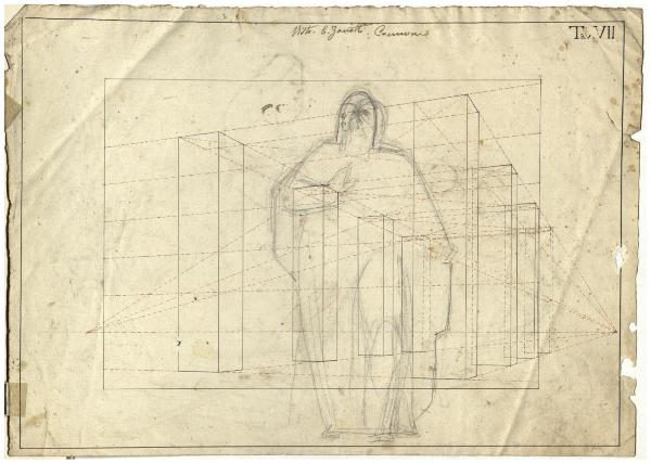 - NOTIZIE STORICO CRITICHE Il foglio mostra una tavola geometrica eseguita con inchiostro nero e rosso. Un abbozzo di figura stante è delineato a matita e deve essere messo in relazione con lo studio della figura di Noé presente sul recto. La tavola riporta il numero VII e in alto si trova una nota manoscritta di avvenuta presa visione da parte di Zanotti del lavoro, eseguito molto probabilmente da Traquillo Cremona durante gli anni dalla sua formazione accademica.