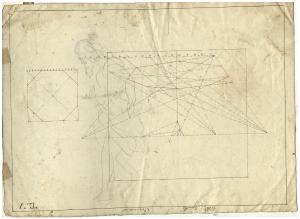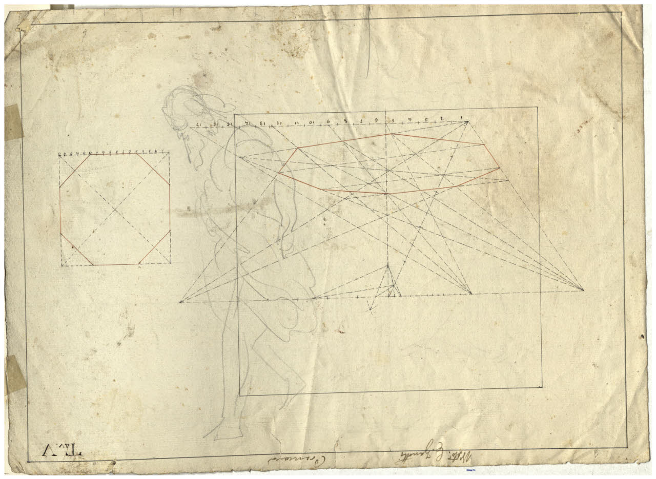 - NOTIZIE STORICO CRITICHE Il foglio mostra una tavola geometrica eseguita ad inchiostro. Un abbozzo di figura maschile di profilo è ugualmente delineato a matita; la tavola riporta il numero V e in alto si trova una nota manoscritta di avvenuta presa visione da parte di Zanotti del lavoro, eseguito molto probabilmente da Traquillo Cremona durante gli anni dalla sua formazione accademica.