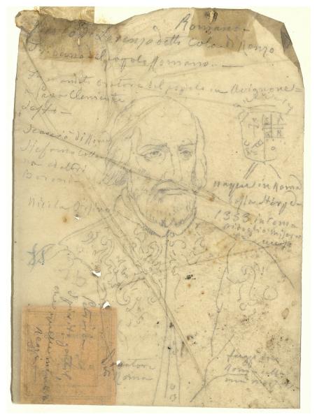 - NOTIZIE STORICO CRITICHE Già appartenuto alla collezione di Luigi Conconi, questo disegno di Tranquillo Cremona raffigura il ritratto a mezzo busto del condottiero medievale Cola di Rienzo, al secolo Nicola di Lorenzo Gabrini. L'effigie è derivata nello stesso verso dall'illustrazione incisa contenuta ne "Ritratti et elogii di capitani illustri" (p. 32) di Giulio Roscio, volume pubblicato a Roma nel 1635. L'artista appuntò inoltre attorno al ritratto alcune notizie biografiche del personaggio desunte dall'elogio di Roscio; alcune delle iscrizioni presenti sul foglio recano indicazioni di colori, probabilmente per una trasposizione pittorica del soggetto. Durante gli anni della sua formazione, ricevuta prima a Venezia e poi a Milano, Cremona si esercitò lungamente attraverso la pratica del disegno: nota è del resto l'abitudine del pittore di portare sempre con sé dei taccuini da disegno nelle sue visite a musei e gallerie (cfr. L. Beltrami, Un maestro Tranquillo Cremona, 1837-1878, Roma 1929). Il foglio in esame fa parte di una serie di uomini illustri immortalati da Cremona a scopo documentario e destinato forse ad un'impresa mai realizzata.