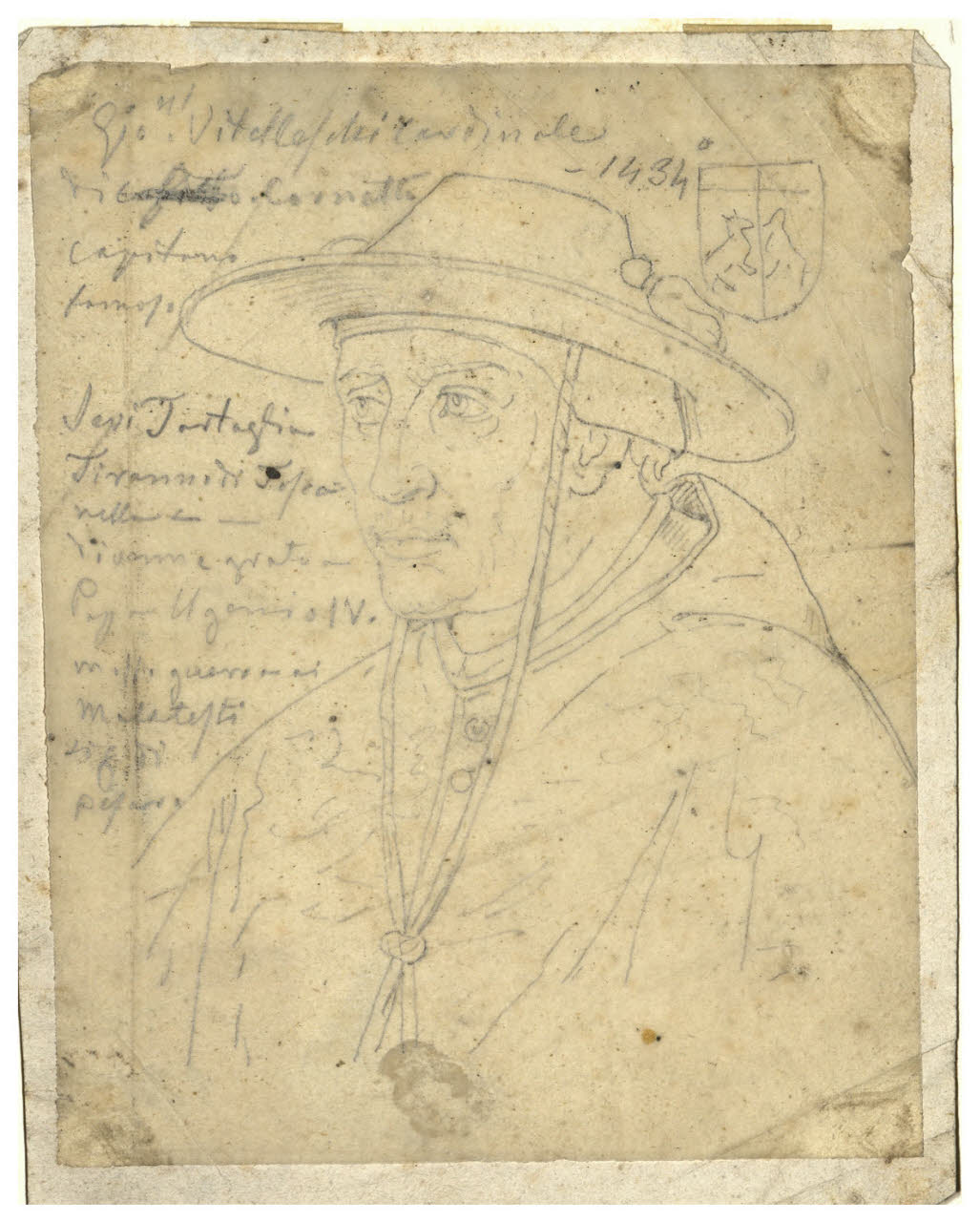 - NOTIZIE STORICO CRITICHE Già appartenuto alla collezione di Luigi Conconi, questo disegno di Tranquillo Cremona raffigura il ritratto a mezzo busto del cardinale Giovanni Vitelleschi. L'effigie è derivata nello stesso verso dall'illustrazione incisa contenuta ne "Ritratti et elogii di capitani illustri" (p. 71) di Giulio Roscio, volume pubblicato a Roma nel 1635. L'artista appuntò inoltre accanto al ritratto alcune notizie biografiche del personaggio desunte dall'elogio di Roscio. Il modello di questa iconografia risale ad un dipinto di Cristofano dell'Altissimo conservato agli Uffizi. Durante gli anni della sua formazione, ricevuta prima a Venezia e poi a Milano, Cremona si esercitò lungamente attraverso la pratica del disegno: nota è del resto l'abitudine del pittore di portare sempre con sé dei taccuini da disegno nelle sue visite a musei e gallerie (cfr. L. Beltrami, Un maestro Tranquillo Cremona, 1837-1878, Roma 1929). Il foglio in esame fa parte di una serie di uomini illustri immortalati da Cremona a scopo documentario e destinato forse ad un'impresa mai realizzata.