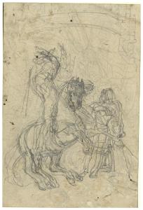 Un armato appiedato e uno a cavallo in atto di combattere. Un armato appiedato e uno a cavallo in atto di combattere