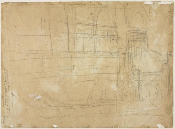 - NOTIZIE STORICO CRITICHE Già appartenuto alla collezione del pittore e incisore Luigi Conconi, questo foglio di Tranquillo Cremona illustra sul verso uno schizzo architettonico con alcune figure stati su una gondola e in basso compare un'iscrizione autografa dello stesso Conconi. Si tratta probabilmente di uno studio per un'opera del periodo giovanile dell'artista.