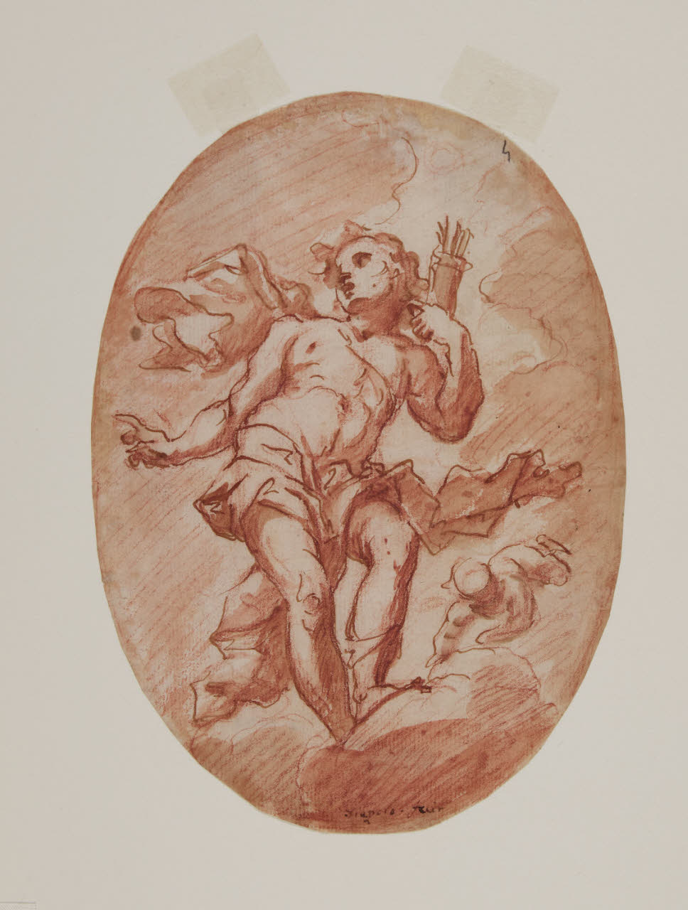 - NOTIZIE STORICO CRITICHE Un tempo attribuito a Tiepolo per l'iscrizione che compare in basso, questo disegno illustrante un Eros con la faretra è stato assegnato da Precerutti Garberi (1969; 1971) a Mattia Bortoloni sulla base di un'analisi stilistica. Martini (1989) riconobbe nel foglio del Castello Sforzesco il disegno preparatorio per uno degli scomparti ovali del soffitto oggi in Ca' Rezzonico a Venezia realizzati dal pittore vicentino Francesco Maffei. Le cinque tele ovali raffiguranti Divinità dell'Olimpo non facevano parte dell'arredo originario di Ca' Rezzonico, ma furono trasferite in questa sede nel 1936 da Palazzo Nani sul rio di Cannareggio e costituiscono un ottimo esempio dello stile estroso e anticonvenzionale del Maffei.