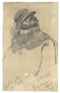 - NOTIZIE STORICO CRITICHE Nel 1880 Uberto Dell'Orto propose all'amico Pompeo Mariani un viaggio in Egitto per arricchire le loro esperienze pittoriche insieme a Sallustio Fornara. Alla fine dell'autunno di quell'anno i tre si imbarcano a Brindisi alla volta di Alessandria d'Egitto. Nel febbraio del 1881, mentre stava dipingendo all'aperto, Pompeo Mariani viene investito da una folata di sabbia che lo ferì all'occhio destro, costringendolo a fare rientro in Italia. Questo ritratto di Pompeo Mariani sofferente agli occhi, firmato da Dell'Orto e datato 27 febbraio 1881, resta a testimonianza delle esperienze del viaggio e del soggiorno in Egitto che i due artisti condivisero. Mariani è presentato a mezzo busto di tre quarti verso sinistra in un pesante paltò con il bavero rialzato e Dell'Orto indugia nella rappresentazione del volto dell'amico pittore, costretto ad indossare una benda e un paio di occhiali dopo l'incidente. Il disegno, appartenuto alla collezione di Pompeo Mariani, suggerisce con velocità e sicurezza le forme sintetiche del soggetto, non senza un certo gusto caricaturale derivante dall'osservazione diretta.